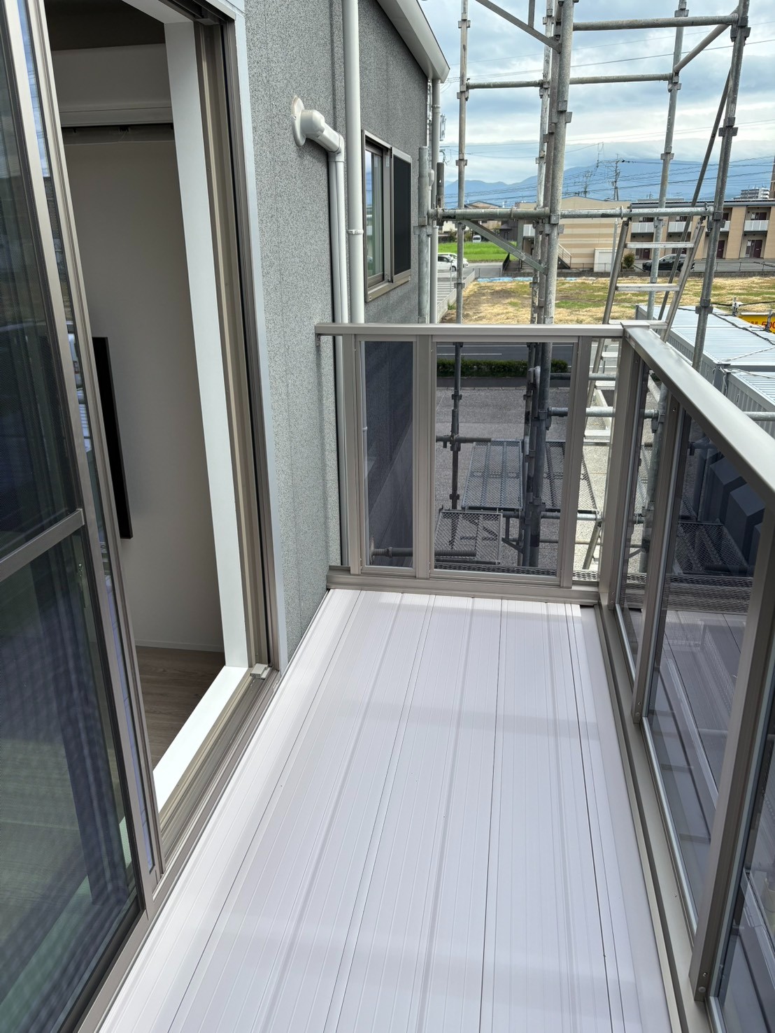 バルコニー床はお手入れしやすい高耐久素材を採用し、雨水が溜まりにくい構造で、清潔に保ちやすい仕様となっています。手すりもクリアパネルを組み合わせることで、開放感を残しつつ落下防止の安全性も確保しました。