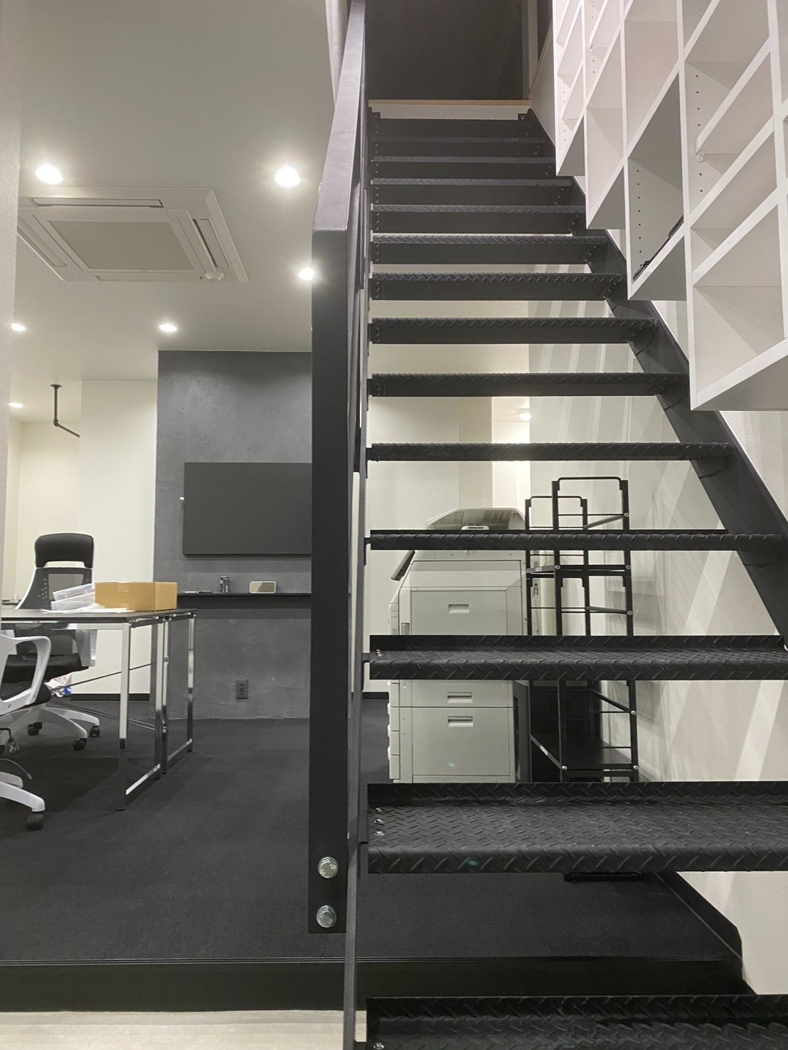 階段スペースにはスチール階段と造作棚を設置し、デザイン性と収納性を両立しています。